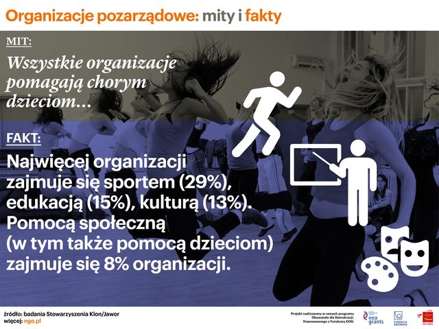 Sport, edukacja, kultura - tym zajmuje się najwięcej fundacji i stowarzyszeń. Takie są fakty. A mit? Wyobrażenie Polek i Polaków, że organizacja pozarządowa to przede wszystkim organizacja zajmująca się chorymi dziećmi. Owszem, takich organizacji jest sporo, robią dużo pożytecznych rzeczy, ale nie przeważają. Tym artykułem kończymy cykl "Pozarządowe mity i fakty", w którym portal ngo.pl rozprawia się z obiegowymi opiniami na temat III sektora.