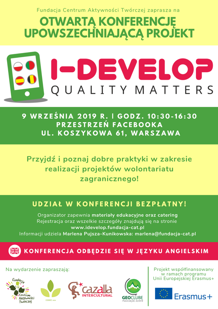 Interesują Cię kwestie związane z wolontariatem zagranicznym? Weź udział w konferencji upowszechniająca projekt I-DEVELOP 9 września. Fundacja Centrum Aktywności Twórczej zaprasza szczególnie mentorów/mentorki, koordynatorów/koordynatorki, wolontariuszy/wolontariuszki, a także pozostałe osoby, które chcą poznać dobre praktyki w zakresie realizacji projektów wolontariatu zagranicznego.