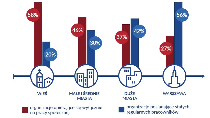Niemal połowa (45%) polskich stowarzyszeń i fundacji opiera się wyłącznie na pracy społecznej. Jedynie z niej korzystają przede wszystkim organizacje działające na wsi. W ten sposób funkcjonuje 58% z nich.