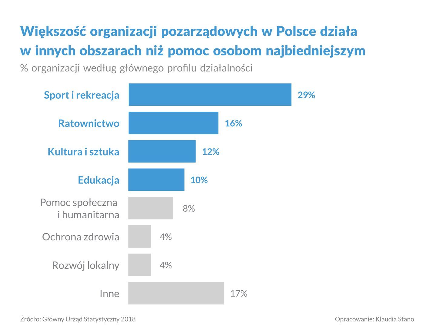 Dane GUS pokazują, że w Polsce zdecydowana większość spośród aktywnych 90 tys. organizacji działa w obszarach innych niż pomoc społeczna czy humanitarna. Najwięcej, bo prawie 30%, zajmuje się szeroko pojętym sportem i rekreacją. Na kolejnych miejscach znajdują się obszary takie, jak: ratownictwo (np. ochotnicze straże pożarne, społeczne służby ratownicze takie, jak GOPR czy WOPR), kultura i sztuka oraz edukacja [1] . Widzimy zatem, że organizacje pozarządowe działają bardziej różnorodnie niż się na ogół sądzi. Trzeci sektor skupia specjalistów z wielu dziedzin, a praca w fundacji czy stowarzyszeniu nie oznacza automatycznie pracy na rzecz osób w trudnej sytuacji życiowej, chociaż oczywiście jest to bardzo ważny obszar działalności organizacji non-profit.