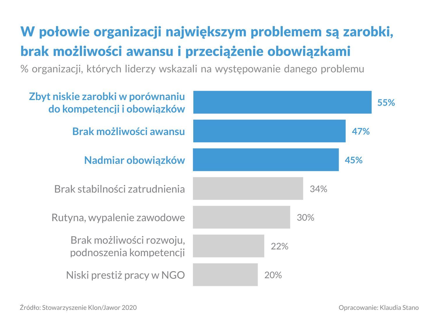 Wskazałam już powody, dla których warto rozważyć zatrudnienie w organizacji non-profit. Czas przyjrzeć się minusom. W marcu 2020 roku Stowarzyszenie Klon/Jawor opublikowało niezwykle ciekawy raport „ZaTRUDnienie. Problemy personelu NGO 2020” [5], który przedstawia największe bolączki pracowników organizacji pozarządowych.