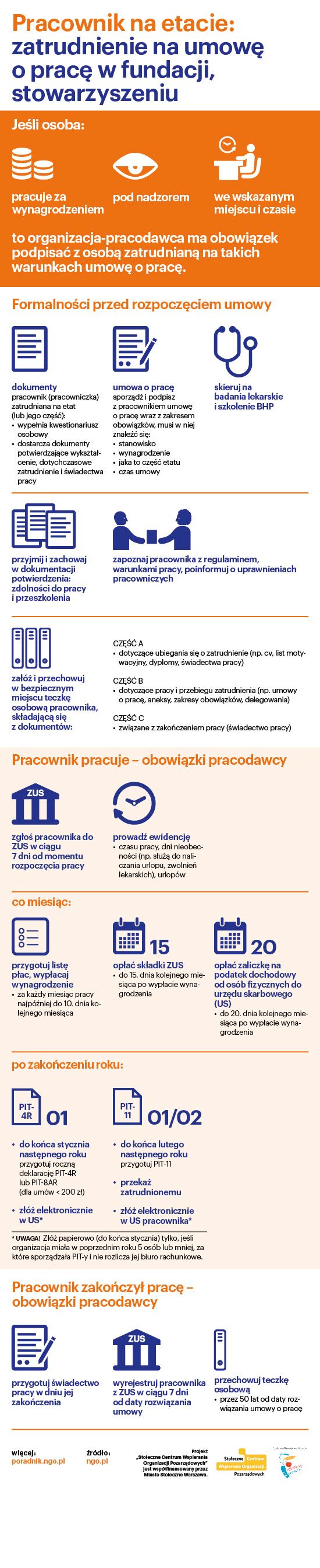Organizacja pozarządowa zawierając umowę o pracę z pracownikiem / pracowniczką staje się pracodawcą i ma comiesięczne i coroczne obowiązki, które musi odpowiednio dokumentować. Sprawdź na naszej infografice, czy pamiętasz o wszystkich.
