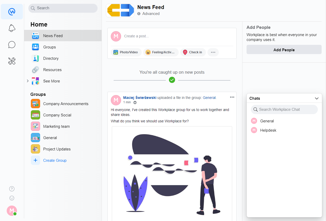W Facebook Workplace znajdziesz funkcje zbliżone do tych znanych ze zwykłego Facebooka. Są aktualności, które wyświetlają powiadomienia dotyczące Twojej organizacji. Są grupy, które służą tutaj jak wydzielone przestrzenie dla zespołów projektowych. Jest czat, który może być komunikatorem wewnątrz grupy, albo pomiędzy konkretnymi użytkownikami. FB Workplace posiada dwie aplikacje mobilne. Ogólną przeznaczoną do korzystania z narzędzia oraz przeznaczoną tylko do komunikacji za pomocą czatu z członkami organizacji (klon dobrze znanego Ci Messengera).