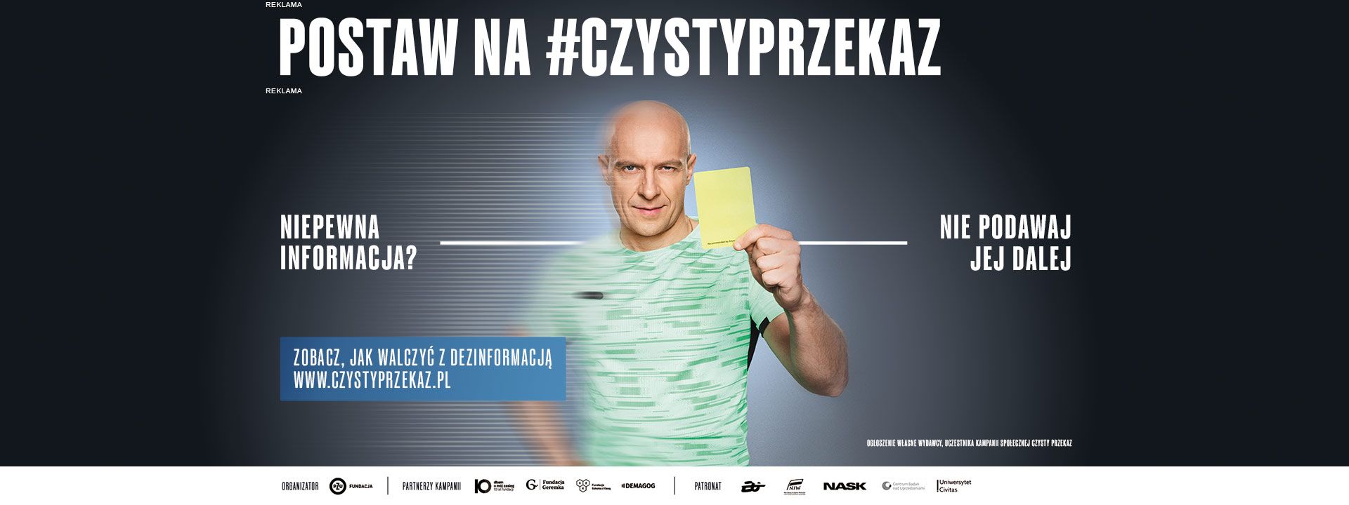 Siłą tej kampanii jest szerokie partnerstwo organizacji społecznych, pod patronatem instytucji publicznych oraz mediów. Jednym z jej celów jest zachęcenie do weryfikowania informacji w wiarygodnych źródłach - a w konsekwencji zwrócenie uwagi na rolę i znaczenie rzetelnych mediów w walce z dezinformacją i zapewnianiu społeczeństwu „czystego przekazu”. Na początku kampania będzie widoczna w mediach, w kolejnych etapach „Czysty przekaz” pojawi się także w szkołach, ponieważ dziś dzieci i młodzież stykają się z dezinformacją bardzo wcześnie. Kampania będzie także obecna na letnich wydarzeniach artystycznych w całej Polsce.