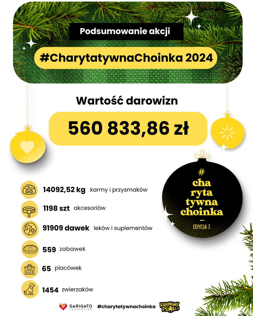 – Za nami kolejna edycja akcji #CharytatywnaChoinka. Jej efekty są najlepszym dowodem na wrażliwość Polek i Polaków, którzy z troską o losy zwierzaków przygotowywali dla nich prezenty świąteczne – mówi Iwona Duda, prezeska Fundacji Sarigato. – Łączna kwota darowizn zgromadzona w edycji 2024 jest wyższa niż rok wcześniej, co nas wszystkich bardzo cieszy i za co serdecznie dziękujemy. Dzięki temu zapewnimy psiakom i kociakom specjalistyczną karmę wysokiej jakości, dopasowaną do ich potrzeb żywieniowych i zdrowotnych. Ale nie tylko. Sporą pulę prezentów stanowią także suplementy oraz różnego rodzaju akcesoria czy zabawki, które są na co dzień potrzebne zwierzętom, a często ich w schroniskach brakuje. W 2023 r. w ramach kampanii #CharytatywnaChoinka zebrano 524 881,41 zł.