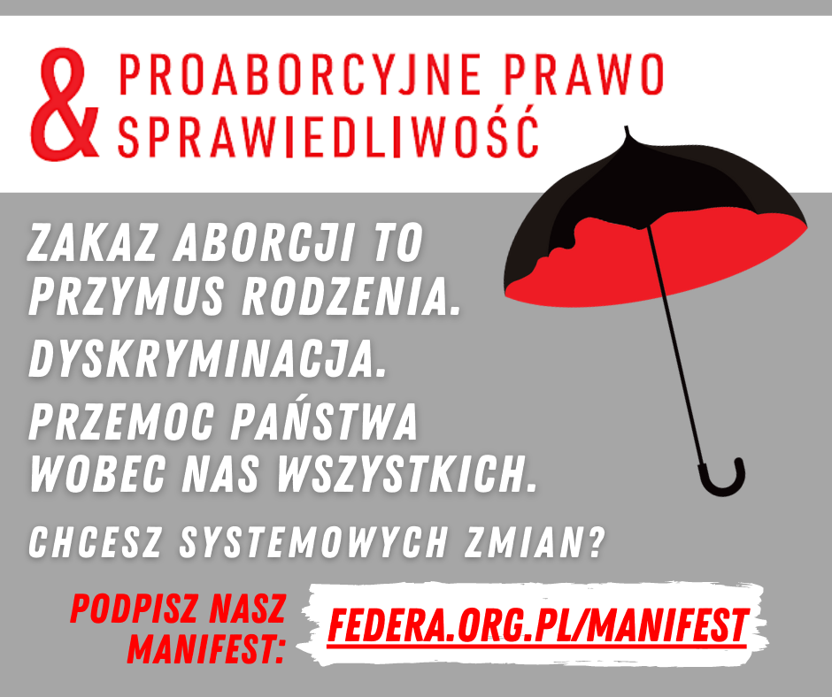 „Sprawiedliwość reprodukcyjna wymaga aborcji legalnej, dostępnej, darmowej. Bo chcemy godnego życia, bez strachu, że państwo zmusi nas do kontynuowania ciąży, a lekarza/lekarkę lub bliską osobę wtrąci do więzienia. Bo w XXI wieku autonomia nie może zależeć od zamożności. Bo decyzje o rodzicielstwie należą do nas”, głosi fragment manifestu, który można sygnować online.