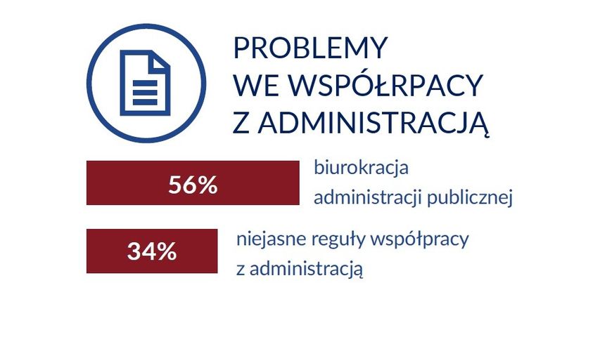 Na problemy ze współpracą z administracją narzeka wiele organizacji pozarządowych. Ponad połowa stowarzyszeń i fundacji (56%) doświadcza nadmiernego rozbudowania biurokracji w administracji publicznej. Z kolei co trzeciej organizacji (34%) doskwierają niejasne reguły współpracy organizacji pozarządowych z administracją publiczną.