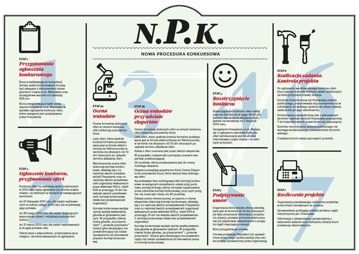 Tematyka wszystkich konkursów skierowanych do organizacji pozarządowych (i innych podmiotów wymienionych w ustawie o działalności pożytku publicznego i o wolontariacie) ogłaszanych w Warszawie musi być związana z dokumentami strategicznymi Urzędu m.st. Warszawy. Tematy konkretnych zadań, które są wpisywane do ogłoszeń konkursowych oraz szczegółowe warunki ich realizacji przygotowywane są przez odpowiednie merytorycznie Biura Urzędu m.st. Warszawy a następnie przedstawiane do konsultacji właściwym KDS-om. Po konsultacjach zaparafowany pod względem formalno-prawnym projekt zarządzenia w sprawie ogłoszenia konkursu ofert, przekazywany jest do akceptacji pod względem merytorycznym Pełnomocnikowi ds. współpracy z organizacjami pozarządowymi. Pełnomocnik z kolei przekazuje projekt zarządzenia do podpisu Prezydenta.