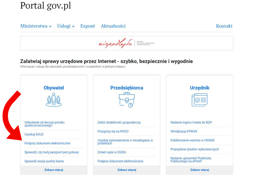 Jak znaleźć usługę? Ze strony głównej gov.pl trzeba kliknąć w tekst „Podpisz dokument elektronicznie”.