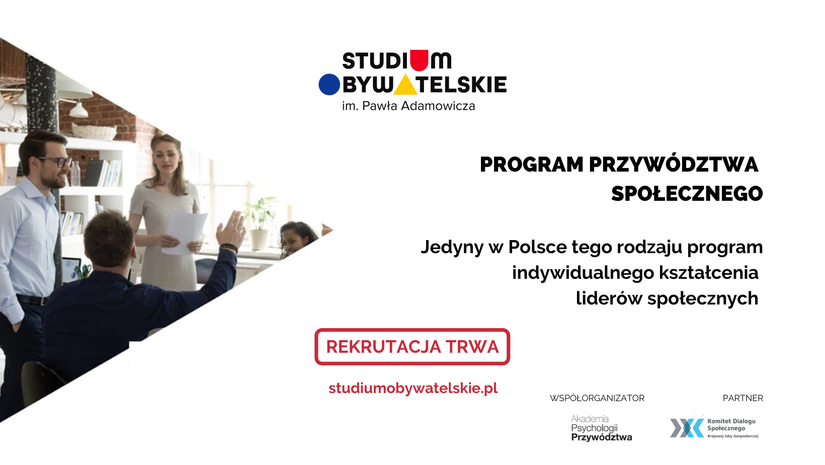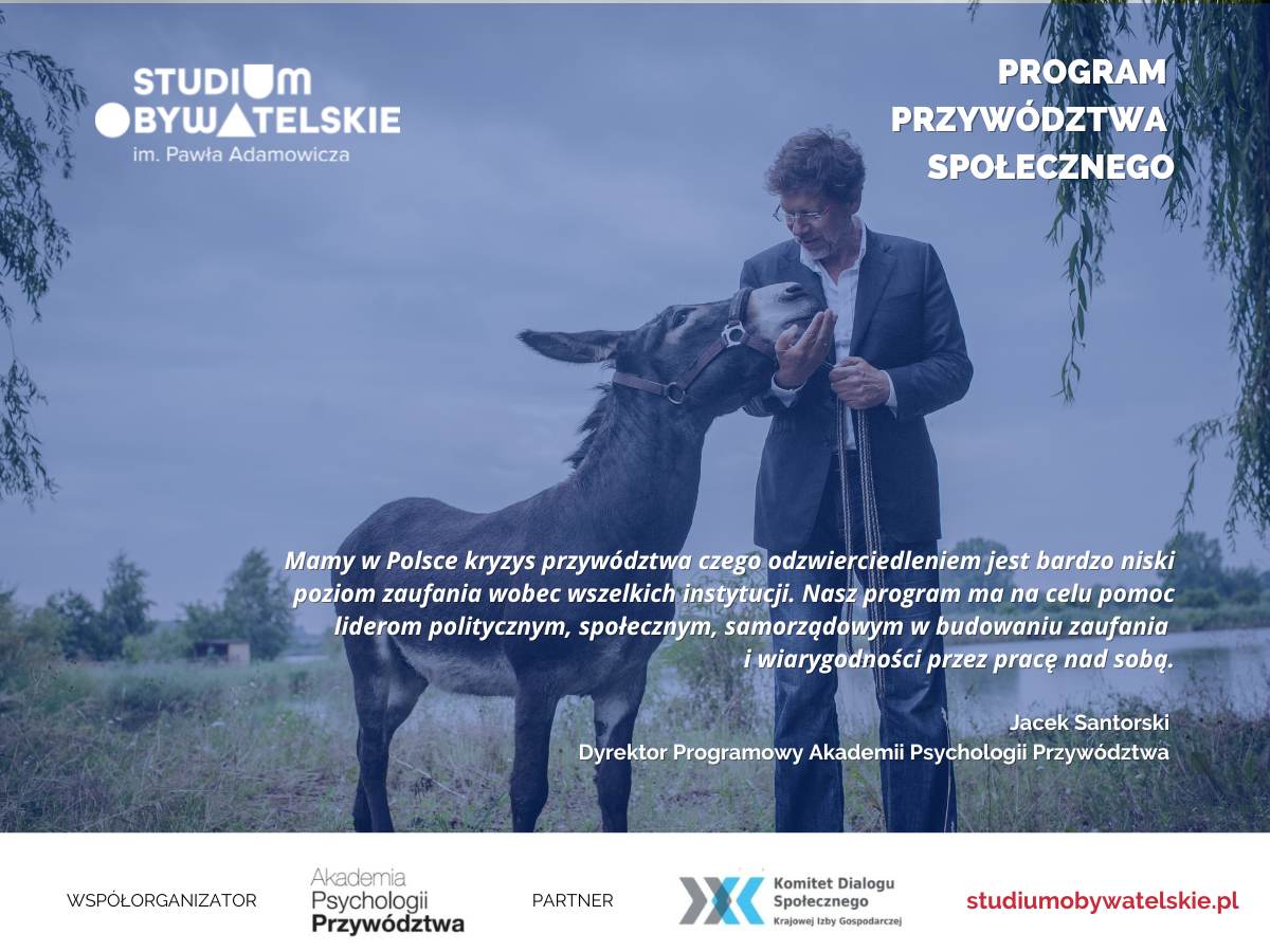 Trwa nabór do bezpłatnego Programu Przywództwa Społecznego, skierowanego do osób aktywnych w sferze publicznej. Zapraszamy liderki i liderów organizacji społecznych, inicjatyw lokalnych i politycznych. Proponowany Program jest oparty o doświadczenia Jacka Santorskiego, przewodniczącego Rady Programowej Akademii Psychologii Przywództwa, wzmocniony o wrażliwość społeczną, która przyświeca wszystkim projektom realizowanym przez Studium Obywatelskie.