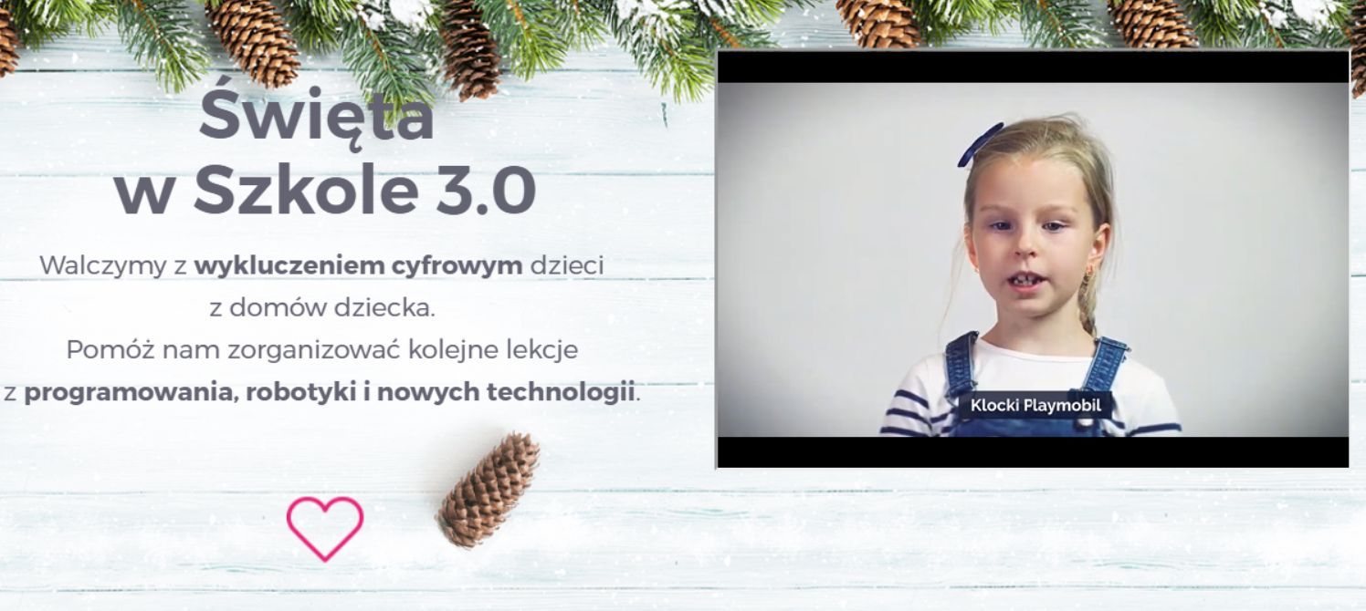 Szkoła 3.0 rusza ze świąteczną kampanią, promującą naukę programowania, robotyki i nowych technologii dla dzieci z domów dziecka. W przygotowanym przez siebie spocie, przedstawia pomysły dzieci na najlepszy prezent pod choinkę. Jak się okazuje, nie wszystkie dzieci marzą o zabawkach. Nawet najmłodsi chcieliby spróbować zbudować robota z klocków lego lub nauczyć się tworzenia prostych gier.
