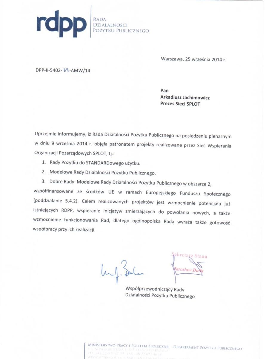 Na posiedzeniu plenarnym, 9 września 2014 r. Ogólnopolska Rada Działalności Pożytku Publicznego objęła patronatem następujące projekty realizowane przez Sieć Wspierania Organizacji Pozarządowych SPLOT: