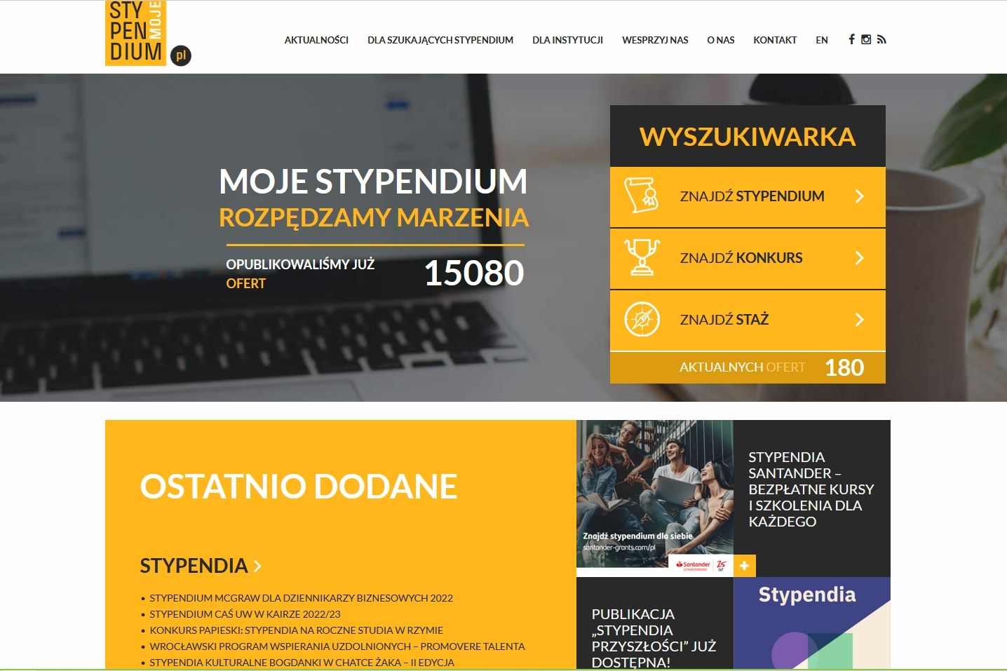 Nasza bezpłatna, dostępna dla wszystkich baza stypendiów, konkursów i staży na portalu MojeStypendium.pl, prowadzona od 2009 roku przez Fundację Dobra Sieć, pomaga znaleźć oferty odpowiadające zainteresowaniom i sytuacji życiowej danej osoby.