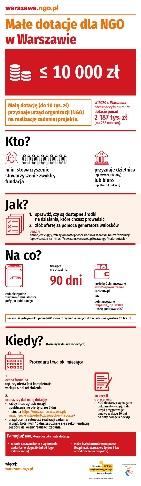 W 2020 r. Warszawa przeznaczyła ponad 2 187 tys. zł na realizację 263 umów w ramach małych dotacji. W lipcu 2021 r. zmieniła się procedura przyznawania małych dotacji. Czym są małe dotacje i jak się o nie teraz ubiegać - tłumaczy nasza infografika.