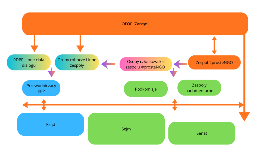 Oczywiście głównym odbiorca prac Zespołu jest Zarząd OFOP-u, który prowadzi wprost (np. petycje, listy, pytania w trybie dostępu do informacji publicznej) lub pośrednio (praca w zespołach roboczych i ciałach dialogu) działania rzecznicze. Zespół jest ważnym zapleczem tej aktywności. Dodatkowo osoby członkowie Zespołu są zaangażowani w prace różnych gremiów, gdzie prowadzony jest dialog nad kwestiami uproszczeń i tam też zgłaszają postulaty Zespołu i monitorują proces legislacyjny. W uproszczony sposób graficzny wygląda to tak:
