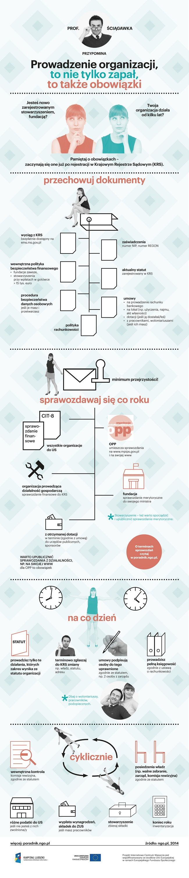 W Krajowym Rejestrze Sądowym jest zarejestrowanych ponad 13 tys. fundacji i 78 tys. stowarzyszeń (dane dla 2013 r.). Co roku rejestruje się kilka tysięcy nowych. I istniejące już, i nowo powstałe, mają dużo obowiązków, które zaczynają się już po rejestracji w KRS. Wiele z nich zależy od skali prowadzonej działalności (np. jeśli nie zatrudnia pracowników ma ich mniej), ale niektóre dotyczą wszystkich organizacji, niezależnie od tego czym i na jaką skalę się zajmują.