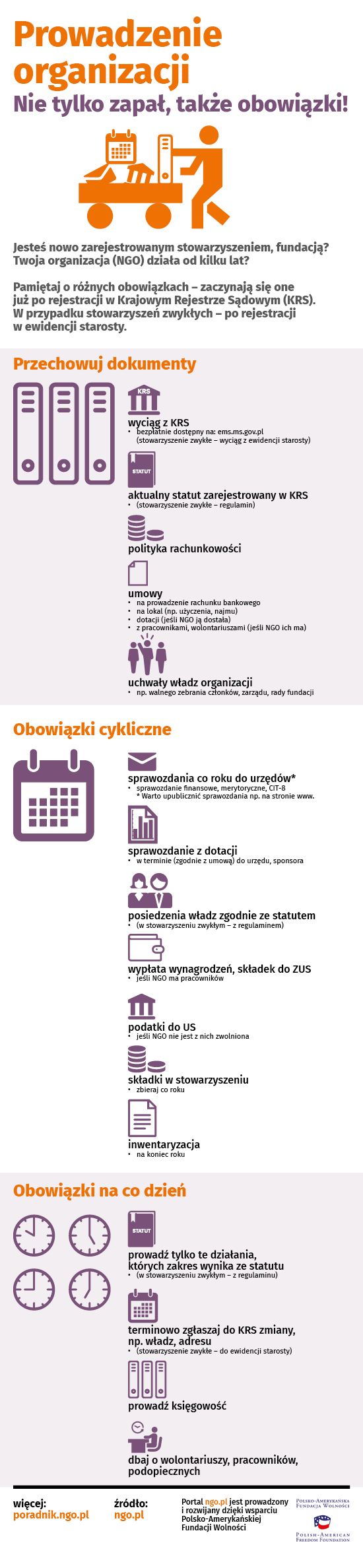 Zarówno istniejące już dłużej, jak i nowo powstałe organizacje, mają dużo obowiązków, które zaczynają się już po rejestracji w KRS (lub w przypadku stowarzyszeń zwykłych w ewidencji starosty). Wiele z nich zależy od skali prowadzonej działalności (np. jeśli NGO nie zatrudnia pracowników ma ich mniej), ale niektóre dotyczą wszystkich organizacji, niezależnie od tego czym i na jaką skalę się zajmują.