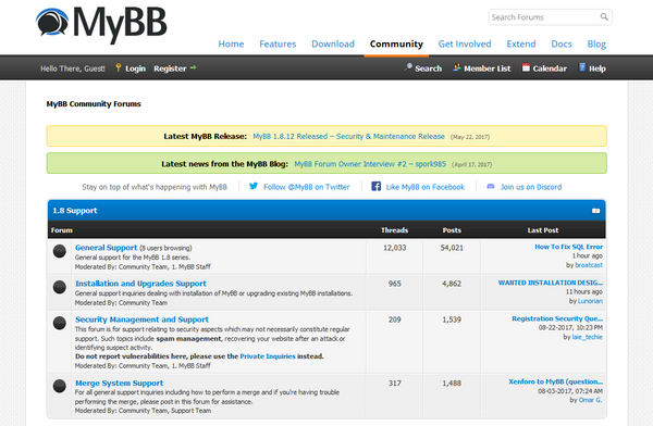 Społeczność MyBB jest nieco mniejsza niż ta zrzeszona wokół phpBB. Oznacza to, że zapewne odnajdziemy wszelkie potrzebne modyfikacje i skórki, jednak ich wybór będzie skromniejszy. Na pochwałę zasługuje lokalna społeczność, która zapewnia dostęp do spolszczonych wersji systemu oraz udziela sprawnej pomocy technicznej.