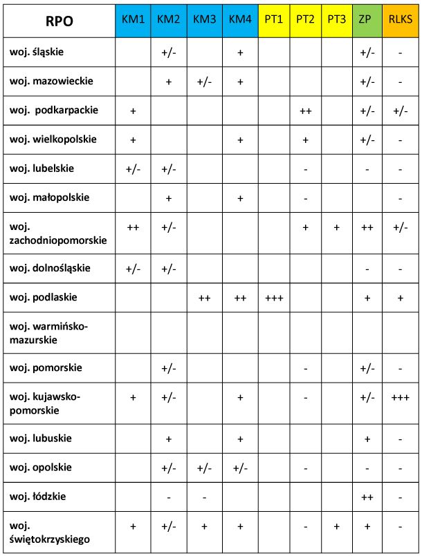 Nie każdy RPO odnosi się do wszystkich postawionych przez nas pytań, dlatego nie każdy został oceniony w odniesieniu do wszystkich z nich. Tam, gdzie pojawiały się zapisy mające odniesienie do pytań, ocenialiśmy czy ich brzmienie z punktu widzenia włączenia partnerów społecznych jest pozytywne (+) czy negatywne (-). Zapisy o niejednoznacznym brzmieniu są oznaczone (+/-).