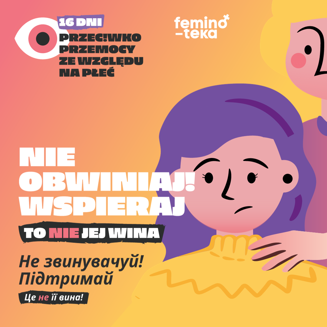 Fundacja Feminoteka prowadzi w czasie 16 Dni Działań przeciwko Przemocy ze względu na Płeć kampanię „Nie obwiniaj! Wspieraj”. Sprzeciwia się w niej obwinianiu pokrzywdzonych za przemoc, która je spotkała. Victim blaming, czyli obwinianie osoby pokrzywdzonej, to wciąż powszechne przekonanie, że osoba, która doświadczyła przemocy jest jej współwinna. To doszukiwanie się w postępowaniu pokrzywdzonej czegoś, co mogłoby usprawiedliwić zachowanie sprawcy. To także przekonanie, że gdyby pokrzywdzona zachowała się inaczej, mogłaby uniknąć przemocy. Victim blaming to częste zjawisko, nie tylko wśród społeczeństwa, ale także przedstawicieli i przedstawicielek instytucji.