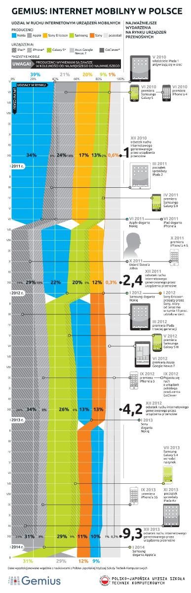 Specjaliści z Polsko-Japońskiej Wyższej Szkoły Technik Komputerowych odpowiadający za przygotowanie infografiki prezentującej dane firmy Gemius, analizującej ruch w polskiej sieci zauważają, że ruch mobilny będzie jedynie wzrastał. Głównym spostrzeżeniem płynącym z infografiki jest wysoka aktywność właścicieli sprzętu Apple. Od połowy roku 2011 do końca roku ubiegłego ruch mobilny w Polsce pochodził głównie z urządzeń tej firmy. Od pewnego czasu dystans między iPhone’ami i iPadami oraz urządzeniami marki Samsung dynamicznie spadał, by z początkiem bieżącego roku Apple ustąpiło koreańskiej firmie.