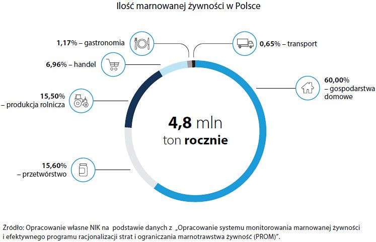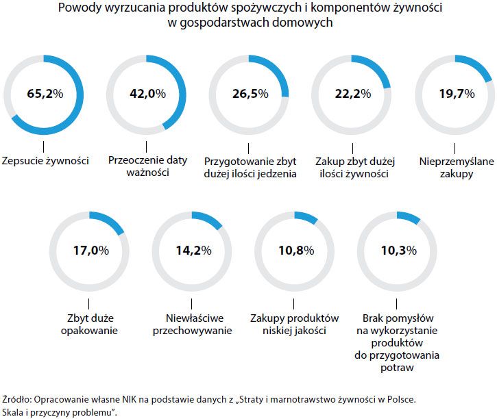 Zdaniem NIK, powodem jest to, że wprowadzone we wrześniu 2019 r. uregulowania dotyczą wyłącznie handlu, tymczasem jak pokazują wyniki najnowszych badań, najwięcej jedzenia trafia do śmieci prosto z naszych domów, aż 60%. Następne w kolejności pod tym względem są: przetwórstwo i produkcja rolnicza (po ok. 16%), a dopiero na czwartym miejscu znajdują się sklepy odpowiadające za 7% marnowanej żywności. To oznacza, że poza regulacjami prawnymi, konieczne są: edukacja i kampanie społeczne na temat racjonalnego planowania zakupów czy zasad właściwego przechowywania żywności.