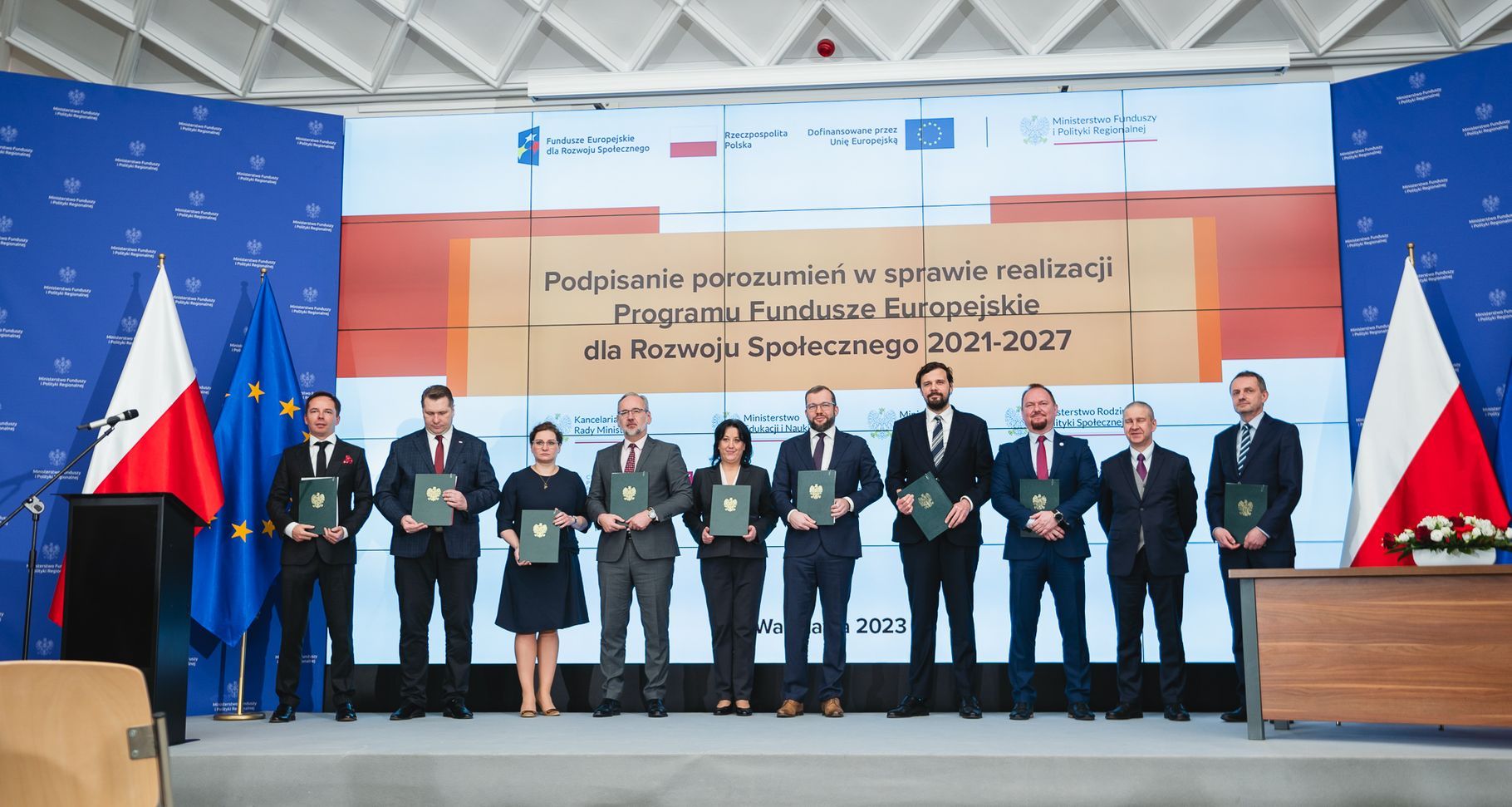 Minister funduszy i polityki regionalnej Grzegorz Puda wraz z przedstawicielami 9 instytucji pośredniczących uczestniczących w systemie wdrażania Funduszy Europejskich dla Rozwoju Społecznego 2021-2027 podpisali dziś porozumienia w tej sprawie.