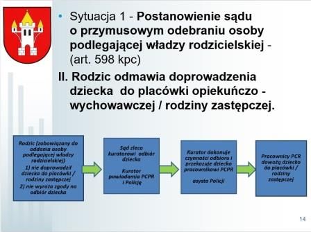 Prowadzący szkolenie specjalista interwencji kryzysowej i pomocy psychologicznej (z certyfikatem „Niebieskiej Linii”) przedstawił cztery możliwe, różniące się od siebie sytuacje, dotyczące konieczności odbioru: a) w związku z postanowieniem sądu o przymusowym odebraniu osoby podlegającej władzy rodzicielskiej (art. 598 kpc); b) w związku z wykonywaniem obowiązków kuratorskich (art. 9 ustawy o kuratorach sądowych); c) przy interwencyjnym odbiorze dziecka przez pracownika socjalnego we współpracy z policjantem i przedstawicielem ochrony zdrowia (art. 12 a UoPPwR); d) oraz w ramach konieczności ochrony życia i zdrowia dziecka przez policję w sytuacjach kryzysowych podczas interwencji policji (art. 1 ust. 2 punkt 1 ustawy o policji w powiązaniu z art. 9d UoPPwR i paragrafem 13 ust.1 i 3 rozporządzenia w sprawie procedury NK - w związku z art. 58 ust. 1 punkt 2 i art. 103 ust. 2 pkt 2 ustawy o wspieraniu rodziny i systemie pieczy zastępczej z wykorzystaniem art. 39 ust. 4 ustawy Kodeks Drogowy oraz w związku z art. 72 Konstytucji RP).