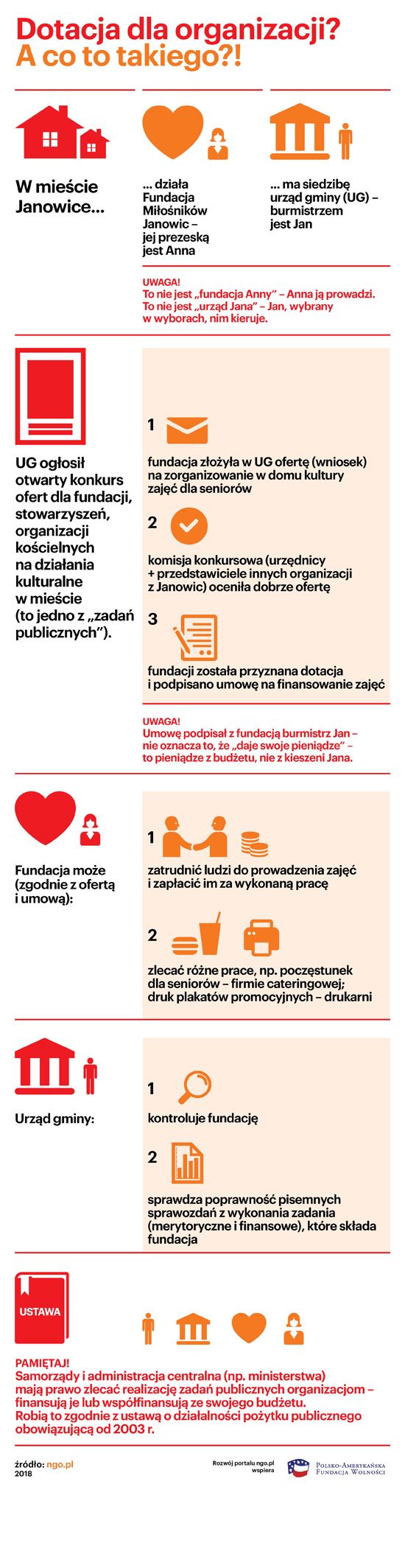 Pamiętaj! Dotacje są przyznawane na realizację zadań publicznych – a nie na "funkcjonowanie" organizacji. Z każdej dotacji organizacja jest rozliczana – co do grosza i nie można na niej zarabiać. Ta zasada obowiązuje od 2003 roku. Podobny system jest stosowany w większości państw rozwiniętych.