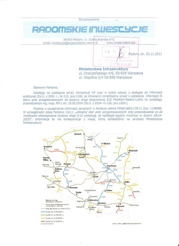 Kontynuując akcję monitorowania przygotowań do budowy drogi ekspresowej S12 Stowarzyszenie 'Radomskie Inwestycje' postanowiło wyjaśnić sprawę terminu realizacji inwestycji.