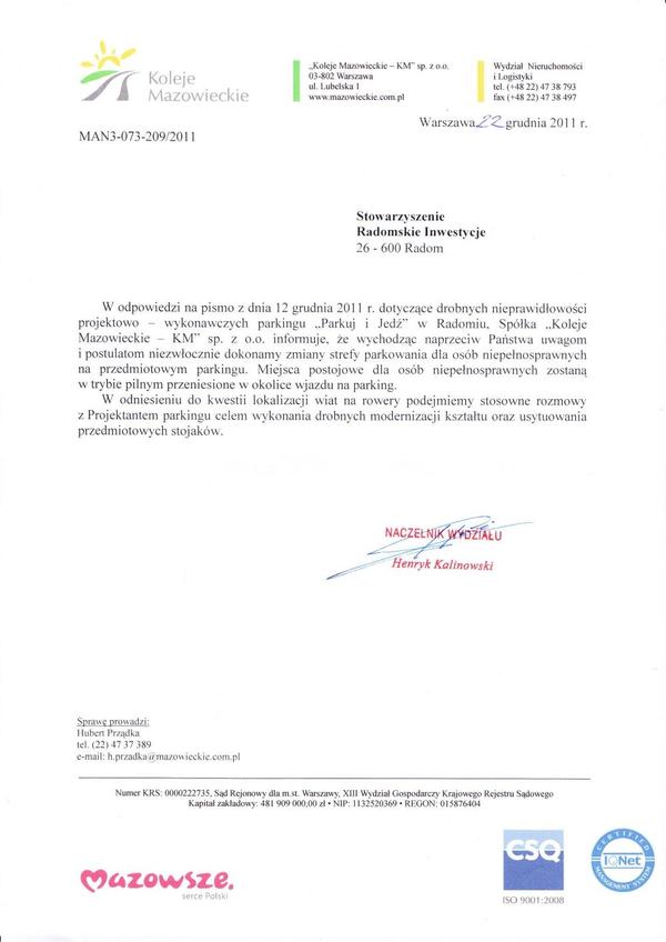Stowarzyszenie 'Radomskie Inwestycje' otrzymało odpowiedź na pismo w sprawie parkingu zrealizowanego w systemie 'Park and Ride'. Z zadowoleniem stwierdzamy, że s-ka 'Koleje Mazowieckie' zamierza w (cyt.) "trybie pilnym" zająć się zarysowanymi problemami.