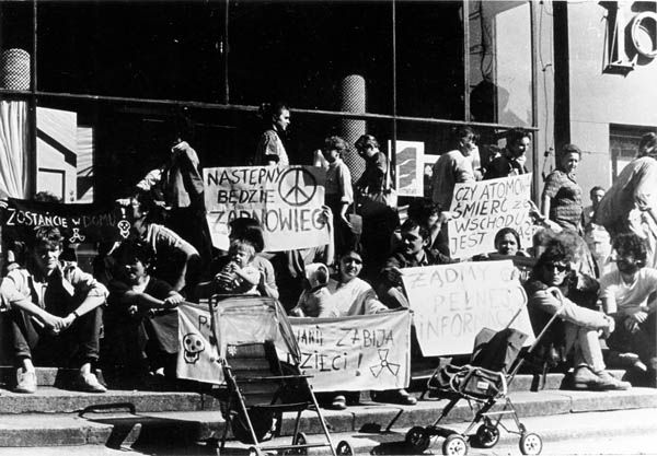 Na zdjęciu "siting" - protest we Wrocławiu na ul. Świdnickiej przeciwko planom budowy atomówki w Żarnowcu (rok 1989).