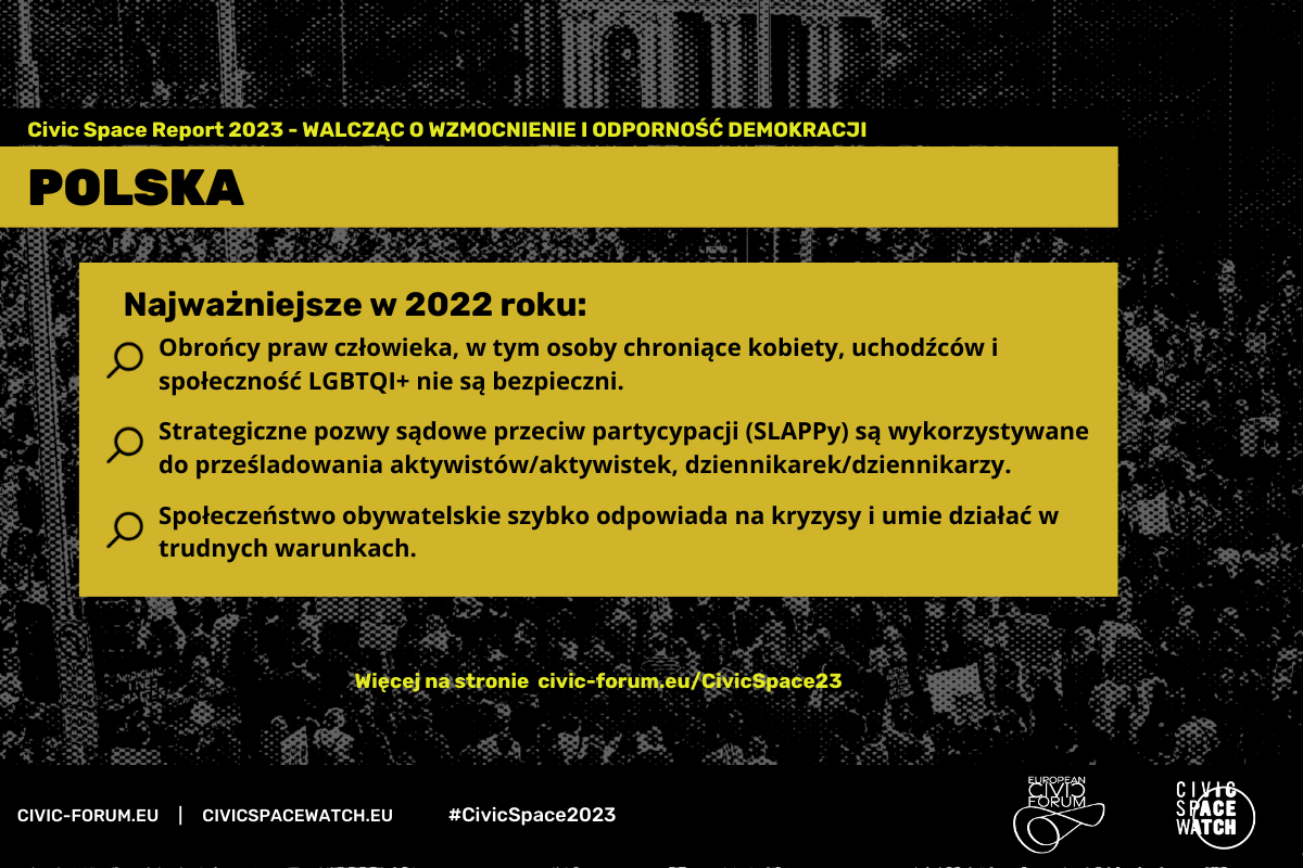 W raporcie mowa też o SLAPPach w Polsce (strategicznych pozwach sądowych przeciw partycypacji publicznej), jako o sposobie na hamowanie głosów krytycznych wobec władzy i na ograniczanie wolności słowa, zarówno w stosunku do dziennikarzy/rek, jak i aktywistów, aktywistek oraz organizacji. Pokazane są przykłady prześladowania przez policję i prokuraturę aktywistek na rzecz praw kobiet, osób LGBTQI+ oraz osób uchodźczych.