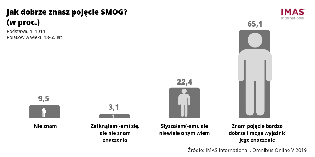 Z badania IMAS wynika, że Polacy bardzo dobrze znają pojęcie „smog”. 9 na 10 zna je przynajmniej ze słyszenia, a niemal 2/3 badanych osób w wieku 18-65 lat deklaruje, że zna je na tyle dobrze, że jest w stanie wytłumaczyć jego znaczenie.