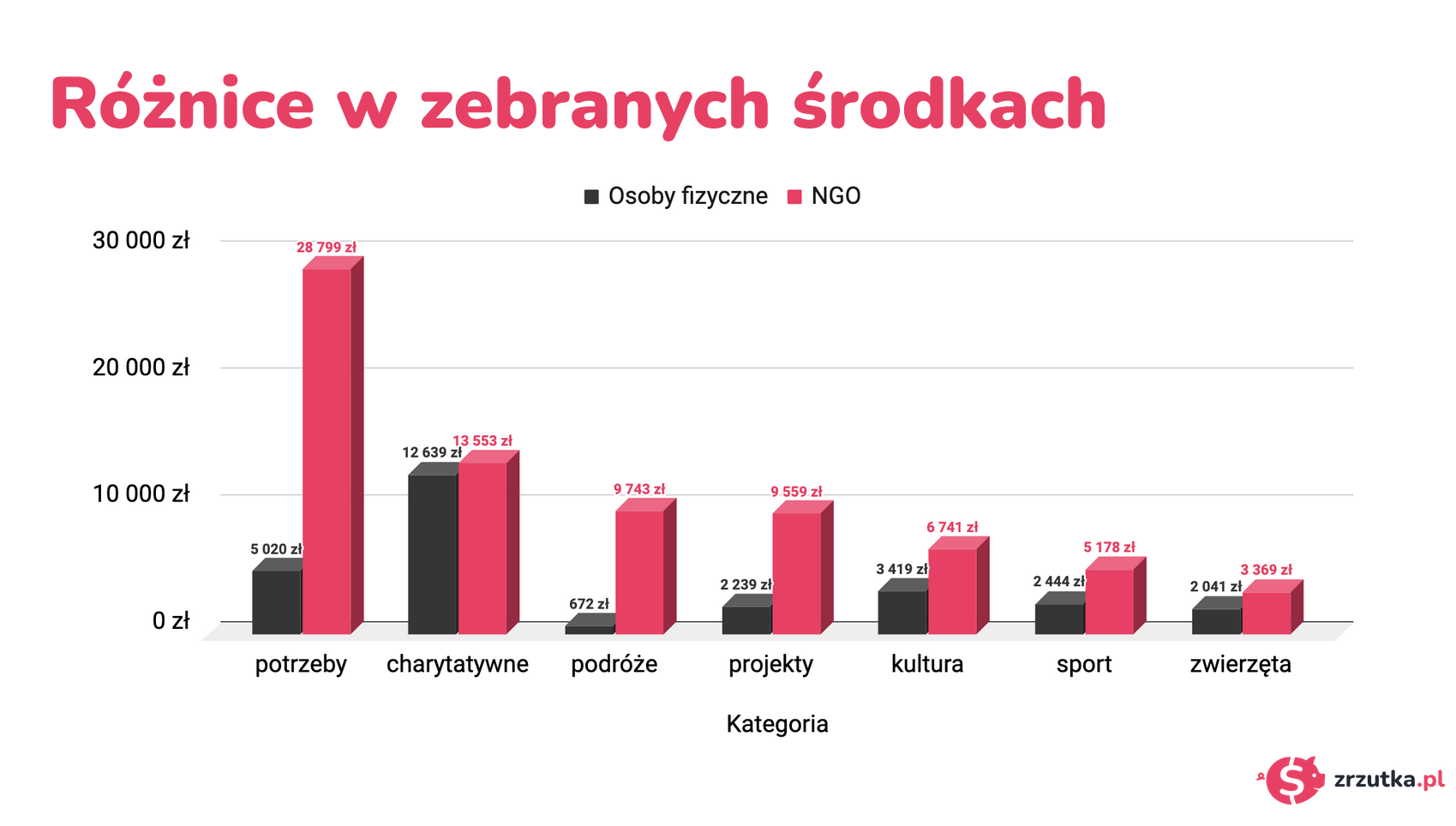 W kategoriach „podróże", „kultura", „sport" i „zwierzęta" zebrane środki są znacznie niższe niż w pozostałych kategoriach na zrzutka.pl, jak i różnice pomiędzy NGO-sami a osobami fizycznymi. Odchylenia wahają się w przedziale 2-3 razy więcej średnio zebranych pieniędzy przez organizacja pozarządowe. Najmniejsze różnice występują wśród „charytatywnych” zbiórek, gdzie różnica wynosi 7,2% na rzecz organizacji pożytku publicznego.