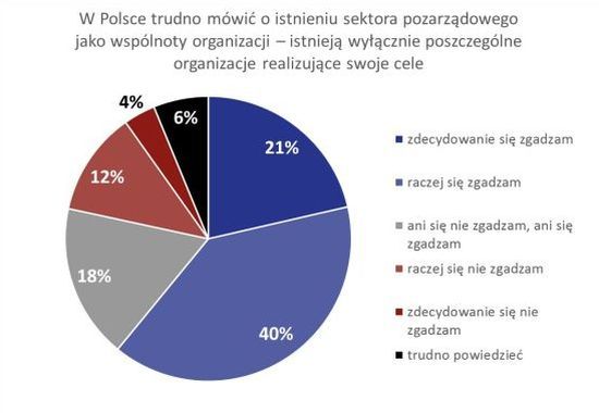 Liderzy organizacji (w badaniu rozmawialiśmy z przedstawicielami zarządów organizacji, którzy byli proszeni o podanie faktów na temat organizacji, ale też odniesienie się do kilku opinii dotyczących sektora pozarządowego) zapytani o to, czy zgadzają się ze stwierdzeniem, że „w Polsce trudno mówić o istnieniu sektora pozarządowego jako wspólnoty organizacji – istnieją wyłącznie poszczególne organizacje realizujące swoje cele”, odpowiedzieli dość wyraziście. Zdecydowana większość, bo 61%, zgodziła się z tym zdaniem, przy czym 21% ma bardzo silne przekonanie, że trudno mówić o trzecim sektorze jako wspólnocie. 16% organizacji ma odmienną opinię i nie zgadza się ze sformułowaniem, że trudno mówić o sektorze jako wspólnocie.