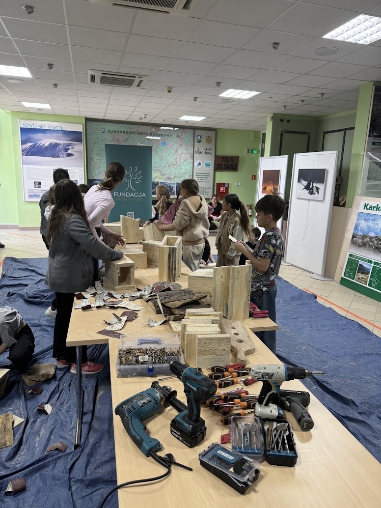 - „Ptaki dziuplaki” - podczas warsztatów uczestnicy dowiadywali się, jakich siedlisk potrzebują ptaki dziuplaste na terenie naszego kraju, gdzie znajdują się ich naturalne miejsca lęgowe oraz w jaki sposób można je chronić i ułatwiać ptakom bezpieczne gniazdowanie. Duży nacisk położono na to, jak pomagać mądrze i etycznie – tak, aby dobre intencje rzeczywiście służyły przyrodzie. Pod okiem specjalisty oraz edukatorów KPN uczestnicy własnoręcznie budowali budki lęgowe, ucząc się przy tym, że ptasie „M” musi być dopasowane do potrzeb przyszłych lokatorów, a każdy element konstrukcji ma swoje znaczenie. Warsztaty łączyły wiedzę przyrodniczą z działaniem praktycznym, a gotowe budki stały się nie tylko efektem pracy uczestników, lecz także realnym wsparciem dla ptasich mieszkańców Karkonoszy – i powodem do prawdziwej dumy dla młodych budowniczych.