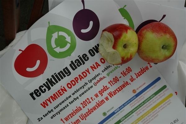 1500 warszawiaków wzięło udział w trzeciej już warszawskiej edycji, akcji Recykling daje owoce. Tym razem organizowałem akcję pod Zamkiem Ujazdowskim, korzystając z gościny Centrum Sztuki Współczesnej, oraz ze współpracy logistycznej i merytorycznej MPO Warszawa. W zamian za dobrze posegregowane odpady warszawiacy otrzymywali jabłka, gruszki i śliwki.