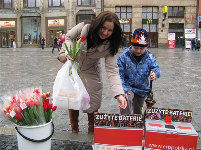 Ekolog i podróżnik Dominik Dobrowolski zorganizował kolejną recyklingową akcję. Tym razem pod wrocławskim pręgierzem zorganizował zbiórkę zużytych baterii, za które rozdawał tulipany.