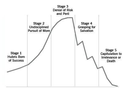 Zespół badawczy pod kierownictwem Jima Collinsa zaczął przyglądać się przedsiębiorstwom, które upadły, szukając różnic w sposobie ich działania w stosunku do firm, które zachowały swoją wielkość i nie upadły. Odkryli w ten sposób pięć etapów upadku.