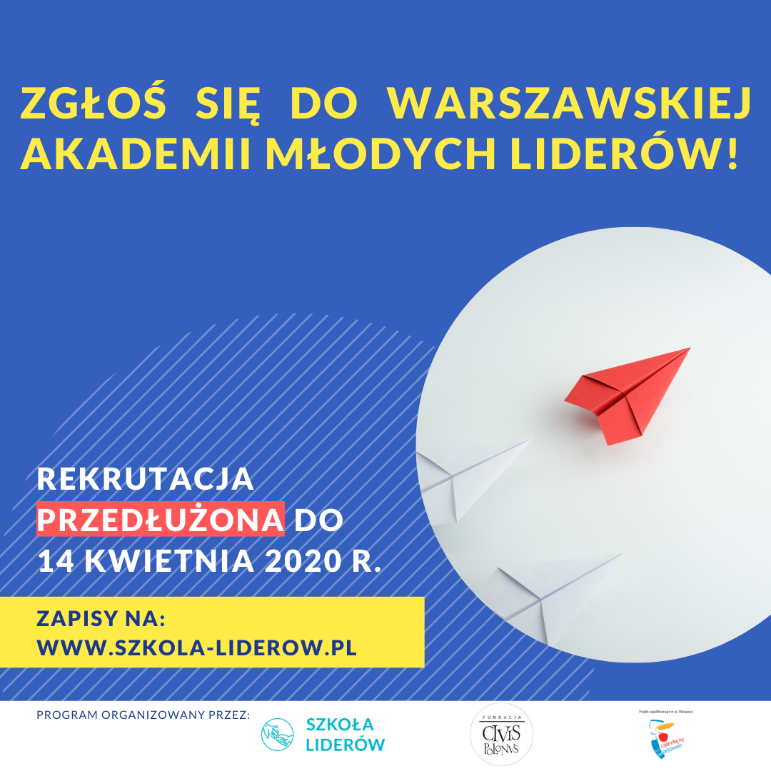 Fundacja Szkoła Liderów i Fundacja Civis Polonus zapraszają do udziału w Warszawskiej Akademii Młodych Liderów. Jest to bezpłatny program skierowany do osób do 26. roku życia, które działają społecznie i chcą mieć wpływ na rozwój Warszawy i jej dzielnic. Rekrutacja do programu została przedłużona do 14 kwietnia 2020 roku.
