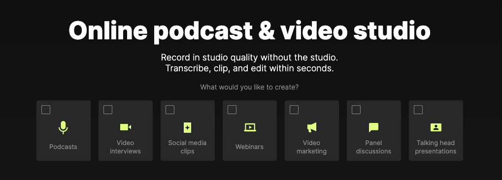 Riverside.fm pozwala na nagrywanie podcastu audio, ale nie tylko. Swobodnie przygotujesz w nim również inne formaty wideo: