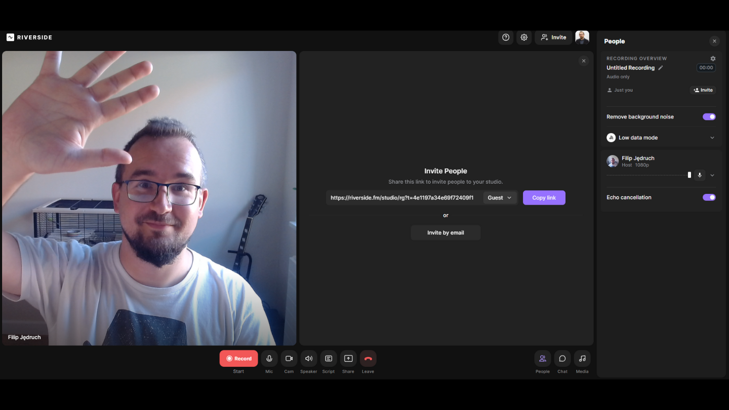 By nagrać wypowiedź lub rozmowę należy stworzyć w Riverside.fm studio nagrań a następnie zaprosić do niego gościa lub gościnię. Wystarczy podać link lub wysłać e-mail. Studio i jego interface, podobne jest do tego, które znamy z popularnych narzędzi do wideo-rozmów, takich jak Zoom czy Google Meet. Główną różnicą jest czerwony przycisk nagrywania. Za każdym razem możemy wybrać, czy będziemy nagrywać wyłącznie dźwięk, czy również obraz.