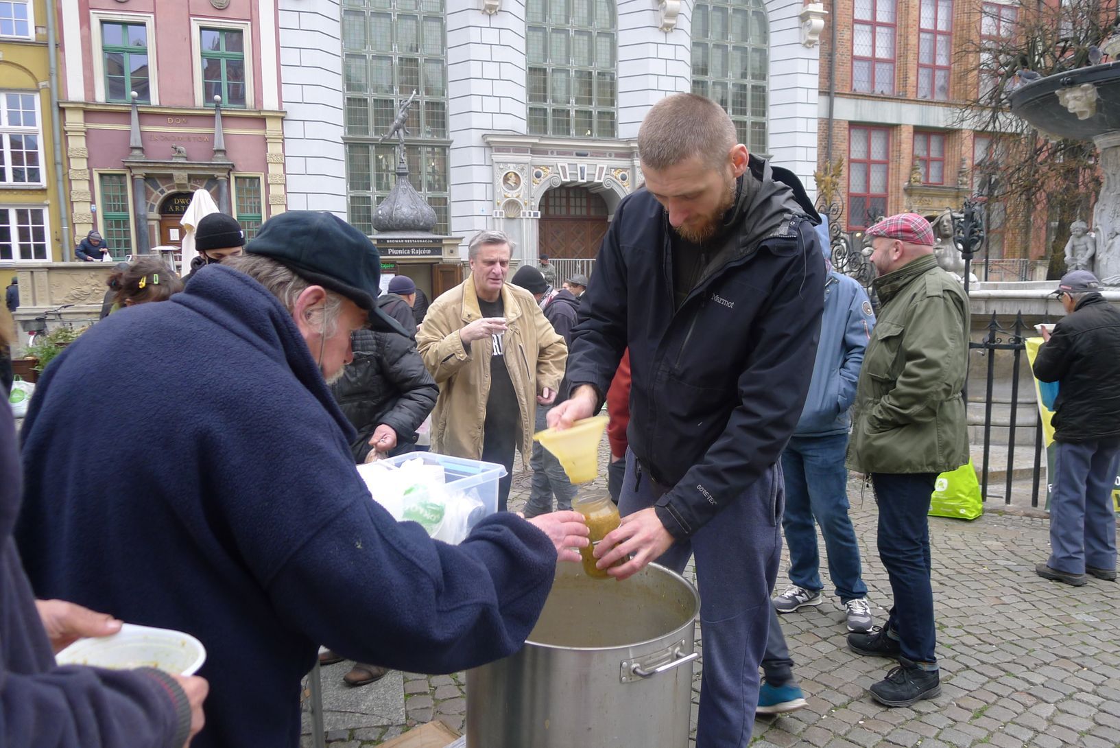 Pochmurna listopadowa niedziela. Szalejące od kilku dni wichrzysko wreszcie się uspokoiło, ale zimne, wilgotne powietrze wślizguje się pod kurtki i płaszcze. Na Głównym Mieście w Gdańsku dzwony okolicznych kościołów właśnie ogłaszają południe. Wokół fontanny Neptuna grupki turystów robią sobie selfie, Długim Targiem spacerują mieszczanie. Z bocznej uliczki wyłania się grupka młodych ludzi. Dwóch gości taszczy wielki, 90-litrowy gar, inny niesie składany turystyczny stolik i spory termos. Dziewczyna w bordowej czapce pobrzękuje kartonami pełnymi słoików. Rozstawiają się tuż przy Neptunie, na ogrodzeniu fontanny wieszają baner. „Jedzenie zamiast bomb” – głoszą czerwone litery. „Bezpłatne gorące posiłki bezmięsne. Co niedziela o 12:00” – informują w kilku językach.