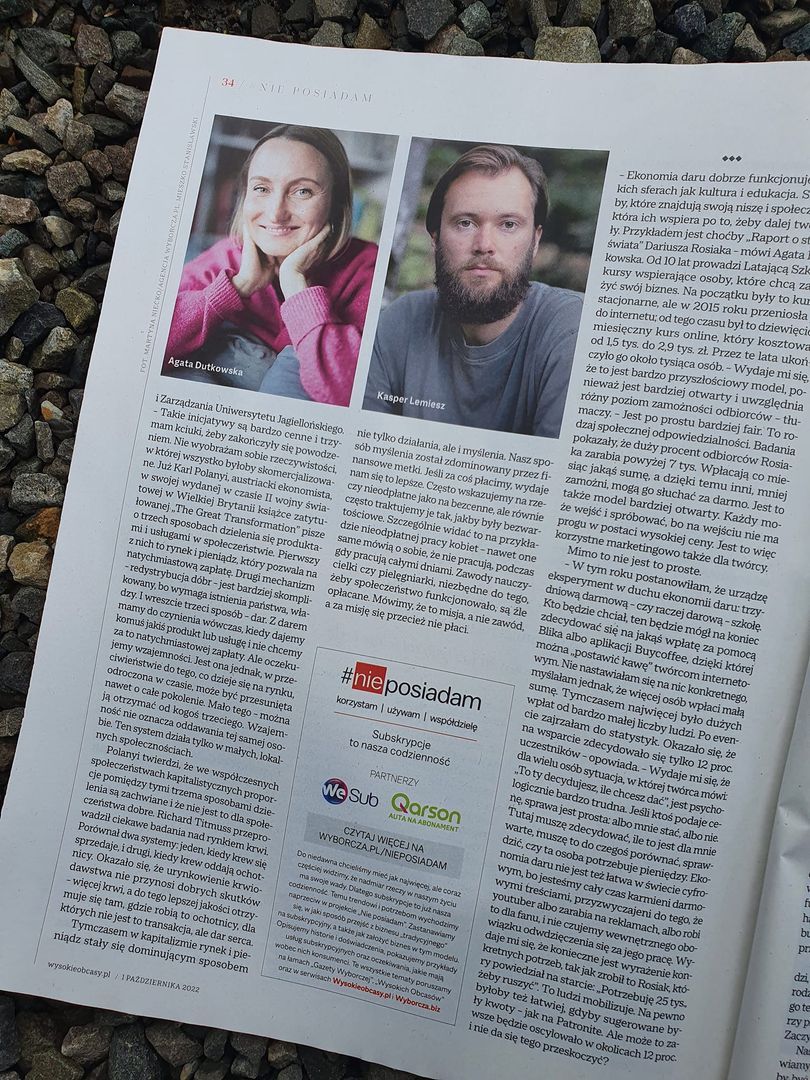 Ekonomia daru może funkcjonować tylko w wiosce, w czymś, co się nazywa na Śląsku hajmatem – „małym centrum świata” (K. Czyżewski). My coś takiego próbujemy próbować budować – robimy wioskę, która wychowuje swoich młodych pod przykrywką formalnego liceum. Tak nawigujemy naszym mitem, żeby za każdym nastolatkiem stało dziesięciu dorosłych, którzy będą odpowiedzialni za jego autentyczne dojrzewanie.
