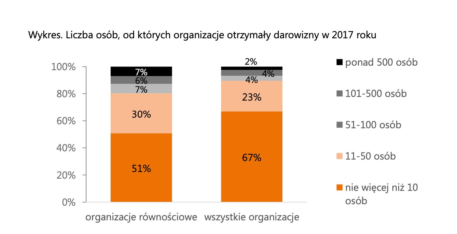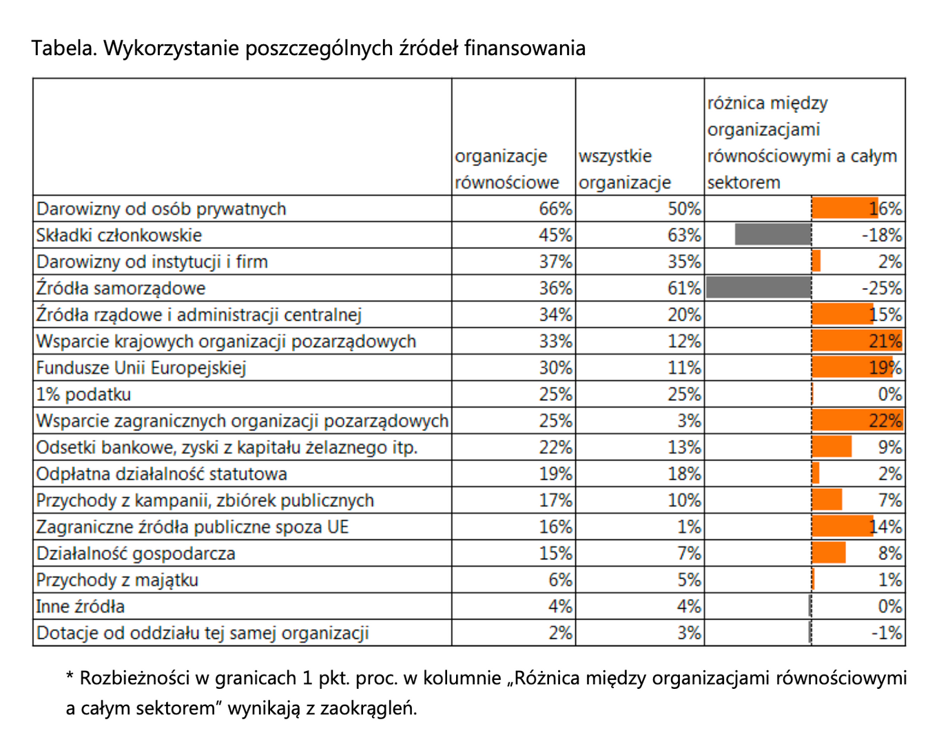 „Kiedy porównamy działania, jakie w celu pozyskania środków finansowych (od osób indywidualnych, firm czy prywatnych fundacji) podejmują organizacje równościowe i pozostałe podmioty trzeciego sektora, okaże się, że przyjmowane strategie się zdecydowanie różnią. Organizacje równościowe wyraźnie częściej starają się pozyskać finansowanie, docierając do potencjalnych darczyńców przez internet (przez wysyłkę maili, swoją stronę czy profil w mediach społecznościowych, a także platformy crowdfundingowe), zaś pozostałe organizacje częściej wybierają narzędzia i metody off-line”.