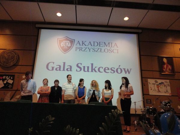 Pozostawmy jednak żmudne przygotowania. Najważniejsze odbyło się dziś. Dwie godziny przed oficjalnym rozpoczęciem Gali do pracy wkroczyli wolontariusze. Zaczęli dekorować salę tematycznie – na rockowo. Na ścianach po chwili już było widać kolorowe nutki i zdjęcia gwiazd rocka, co silniejsi w płucach dmuchali balony. I tu można było zobaczyć tutorów w akcji tutoringu. Jedna osoba była mistrzem, więc instruowała innych jak należy wiązać napompowany balon. Postaram się przytoczyć tą szybką i jakże jasną instrukcję – nigdy nie wiadomo kiedy się przyda. Otóż, należy nadmuchać balon do wielkości nam odpowiadającej, końcówkę do zawiązania nawinąć na dwa palce (obowiązkowo dwa palce-nie więcej, nie mniej!!!) i przytrzymać kciukiem. Potem palcem drugiej ręki zgrabnie rozszerzyć powstałe zawiniątko i szybko „wymienić” z palcem pozostającym w zawinięciu. Ta-dam i gotowe! Powinno się udać. Jeśli nie, to może w następnym roku AKADEMII nasz kolega przygotuje film instruktażowy. Tym sposobem nadmuchaliśmy chyba około setki niebieskich balonów AKADEMII! Zajęły prawie całą scenę w Auli Jana Pawła II na Uniwersytecie Kardynała Stefana Wyszyńskiego. Zmieścili się jednak na niej mimo wszystko także nasi prowadzący. Świetnie w tej roli odnalazła się Gabrysia Górska i Tomek Roda. Podsumowali oni rok w warszawskiej AKADEMII PRZYSZŁOŚCI, zaznaczyli jak ważne są cotygodniowe zajęcia z uczniami. Bez tak częstych spotkań, które są podstawową zasadą działania w AKADEMII, nie wytworzyłaby się tak wspaniała więź między tutorami i ich podopiecznymi. Przypomnieli wiele wspólnych wydarzeń. Zaczęło się oczywiście od inauguracji, poprzez Mikołajki, wycieczki do muzeów, Centrum Nauki Kopernik, czy warsztatów „Zośki”.