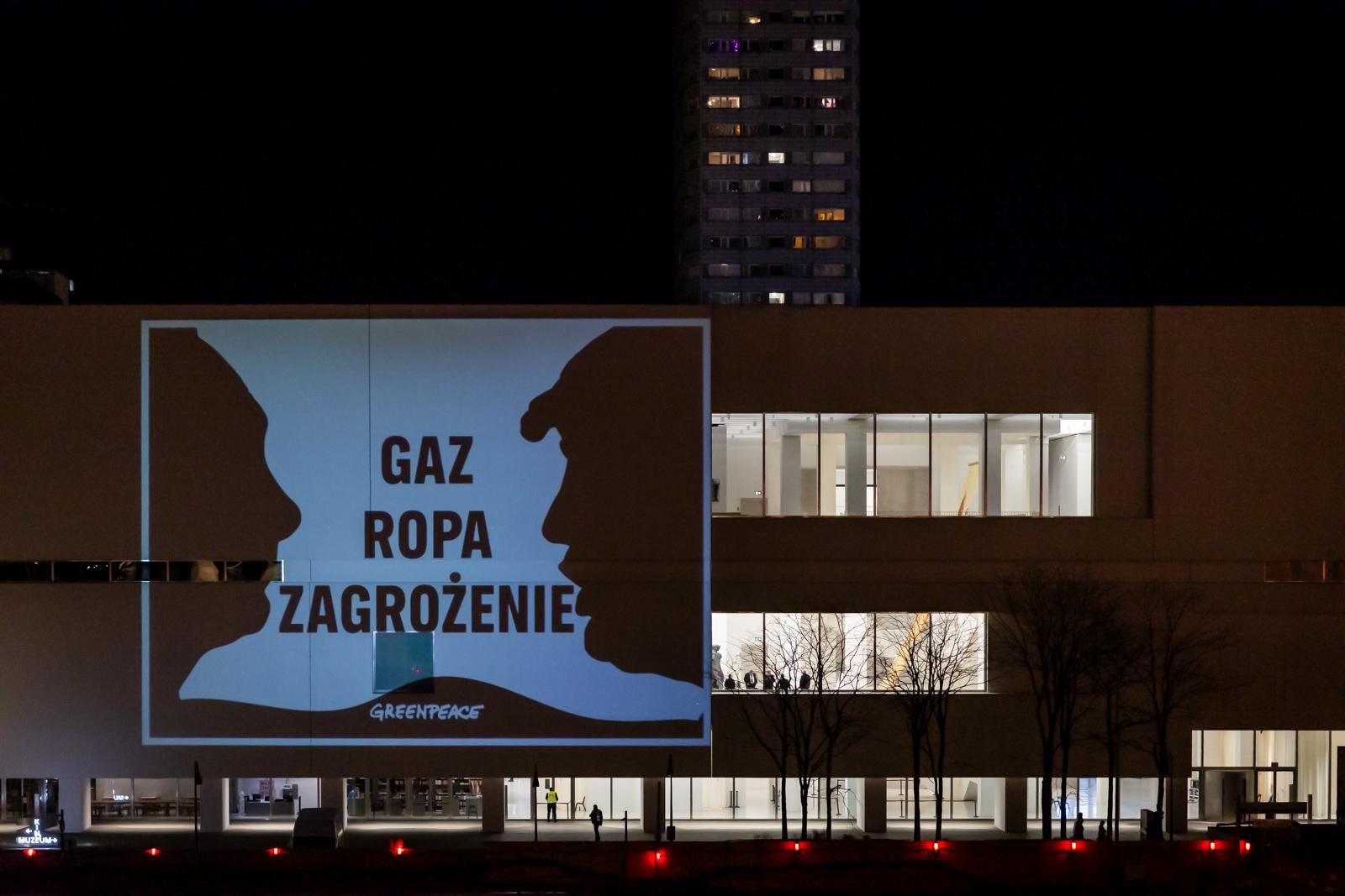 Pod osłoną nocy grupa aktywistek i aktywistów Greenpeace rozwiesiła w centrum Warszawy plakaty z podobiznami prezydentów Trumpa i Putina wraz z przekazem: ropa i gaz to wojna, cierpienie, drożyzna, chaos i zagrożenie. Podobne przesłanie wyświetlili też w sercu stolicy – na budynku Muzeum Sztuki Nowoczesnej. W ten sposób chcą przekonać rząd do szybkiej transformacji sektora energetycznego i trwałego odcięcia się od importu paliw kopalnych.