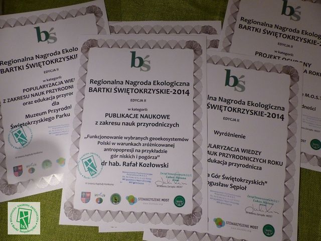 W siedzibie Dyrekcji Zespołu Świętokrzyskich i Nadnidziańskich Parków Krajobrazowych w Kielcach, 5 grudnia 2014 roku odbyło się uroczyste wręczenie nagród przyznawanych za wybitne osiągnięcia w dziedzinie przedsięwzięć przyrodniczych i ekologicznych. Nagrodę przyznaje niezależna Kapituła złożona z 6 osób: działaczy społecznych, przyrodników, naukowców. To jedyna tego rodzaju nagroda przyznawana w województwie świętokrzyskim.