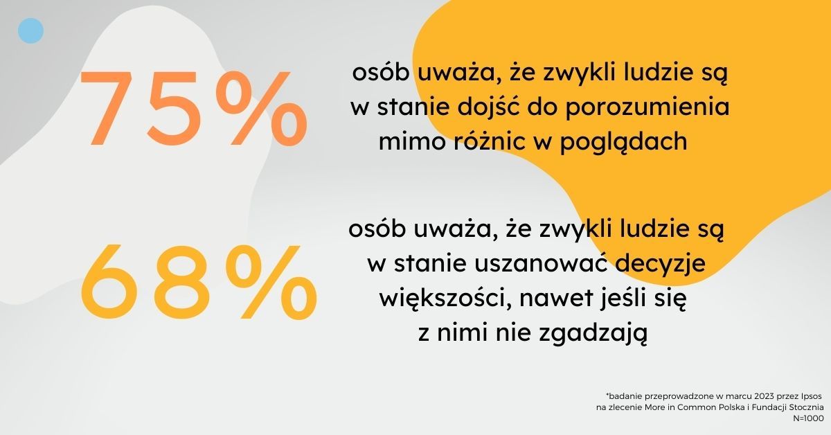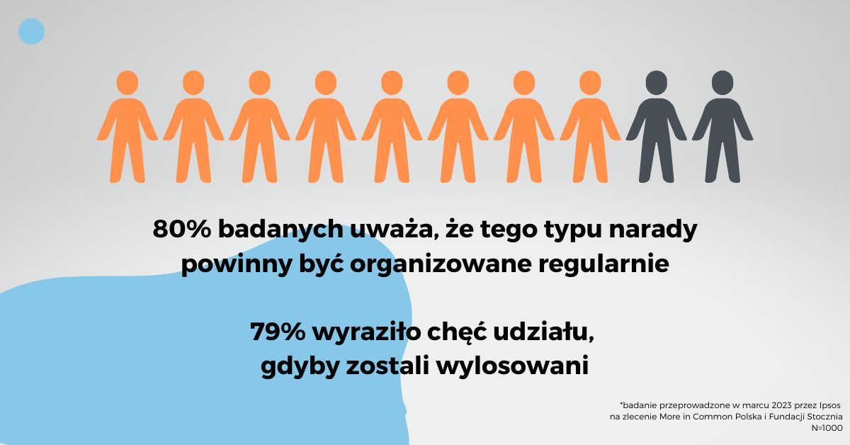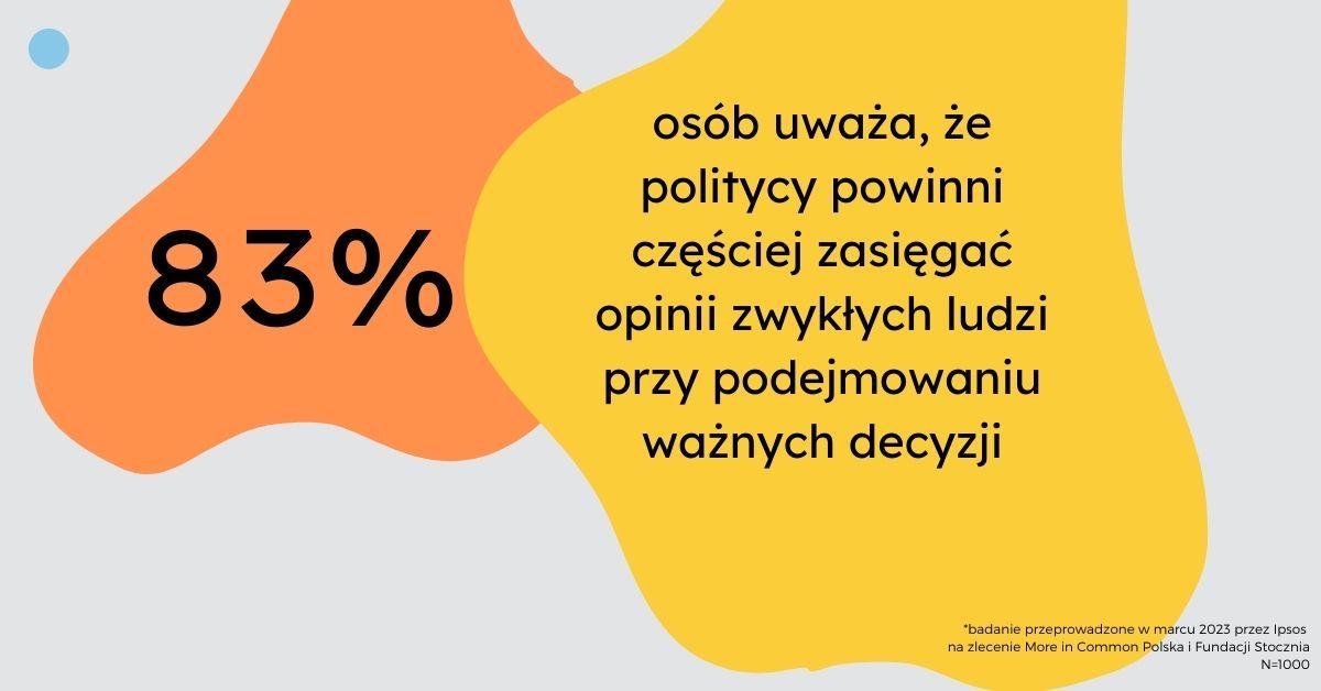 Kwestii ważnych i trudnych do rozwiązania mamy w Polsce bardzo wiele, ale trzeba o nich rozmawiać w inny sposób niż dotychczas. Taki, bardziej włączający kierunek tworzenia polityki krajowej popiera aż 80% Polek i Polaków zapytanych w sondażu IPSOS. Ich zdaniem narady obywatelskie powinny odbywać się regularnie i stać się stałym narzędziem podejmowania ważnych decyzji politycznych w różnych tematach społeczno-politycznych. Wierzą, że ten sposób rozmowy może przyczynić się do zmniejszania napięć społecznych.